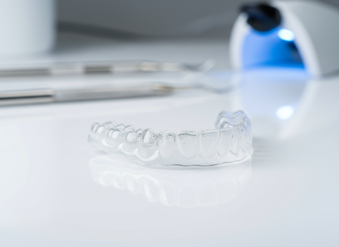 透明マウスピースは医療用プラスチック素材で作られており、歯にぴったりフィットする設計となっています。